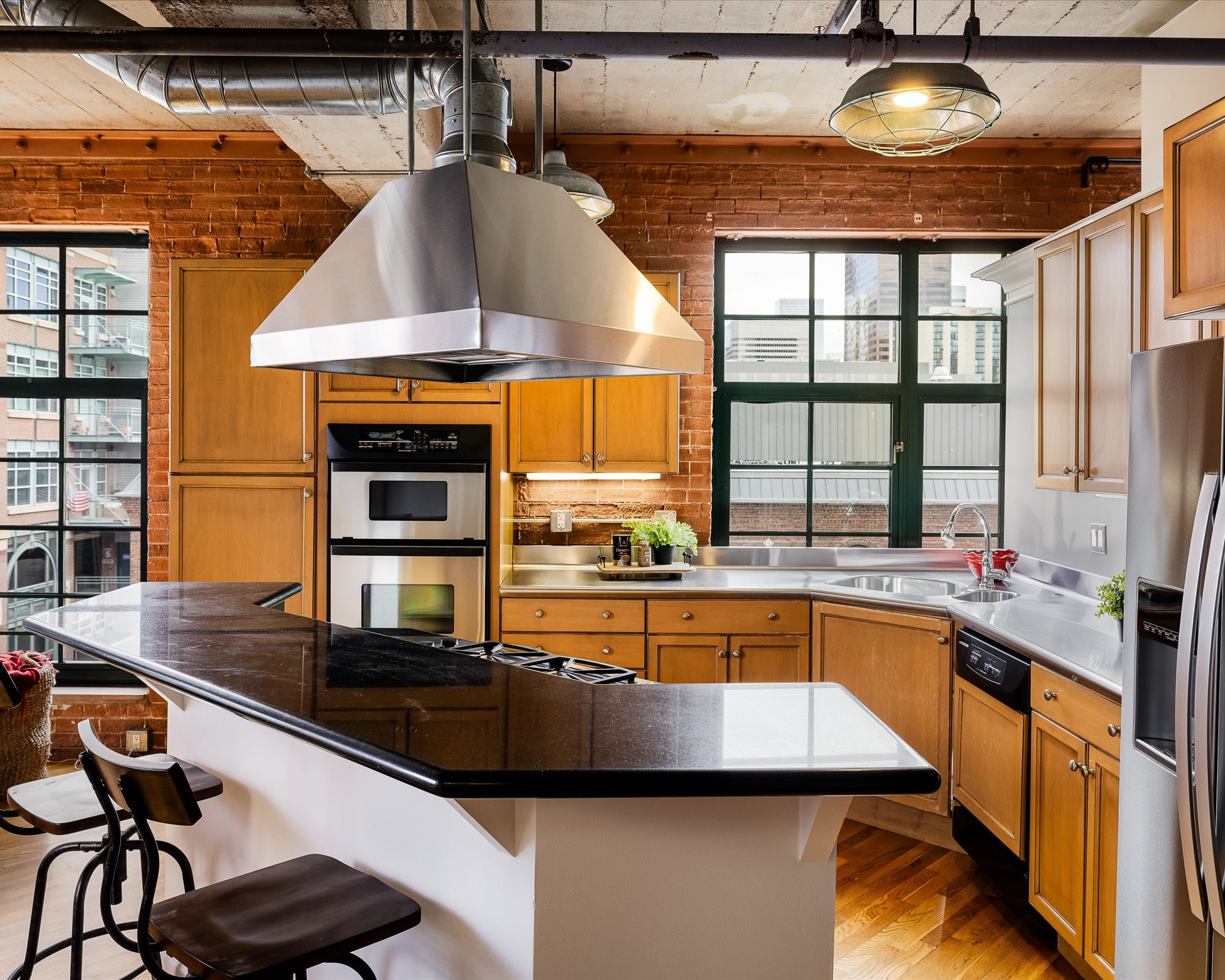 The living room exudes spaciousness with windows enveloping the entire corner, flooding the space with lots of natural light and creating the perfect ambiance. Picture yourself savoring your morning coffee or evening cocktail as you soak in the views of McGregor Square and LoDo. The combination of exposed brick and concrete ceiling, this lofts for sale in downtown Denver has a chic industrial aesthetic, brimming with character and allure.